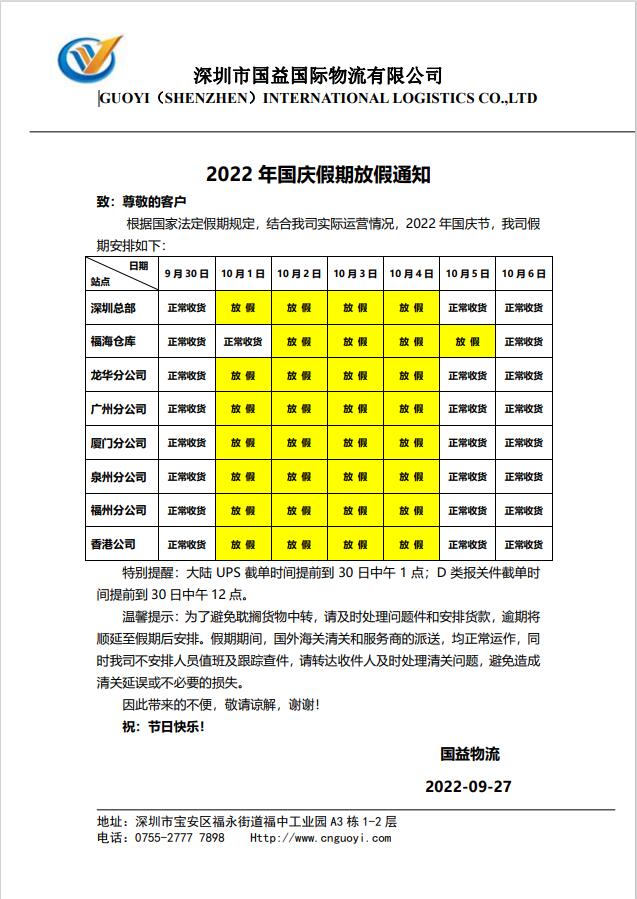 尊敬客戶,你好!如下是我們國慶節(jié)放假通知,提前祝大家節(jié)日快樂!