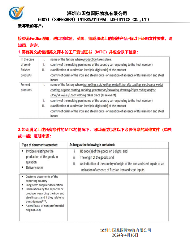 接香港FedEx通知,進口到歐盟、英國、挪威和瑞士的鋼鐵產(chǎn)品需要提供相關(guān)資料